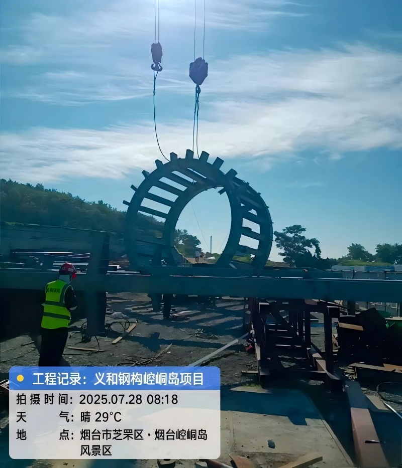 Nýlega var Dongyou verkefnið á Kongtong Scenic Area, sem er lykilatriði menningar- og ferðaþjónustuverkefni í Yantai City. Það náðist mikilvægur byggingaráfangi - að hífa hringlaga bjálkann í leikhúsmiðstöðinni. Á staðnum, þegar 650 tonna beltakraninn hækkaði hægt, var 24 tonna hringlaga burðarbitinn í kjarnasvæði leikhússins nákvæmlega hífður. Þetta leikhús, sem ætlar að flytja austurlensku goðsögnina, reisti formlega sína „stál burðarásÞetta lykilferli markar mikilvægar áfangaframfarir í smíði stálbyggingarverkfræði og skapar hagstæð skilyrði fyrir skipulega framgang alls verkefnisins.